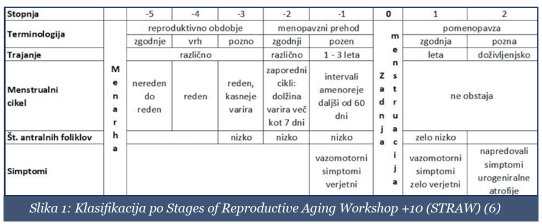 Po novi klasifikaciji obdobja v ženskem življenju razdelimo na reproduktivno obdobje, menopavzni prehod ali perimenopavza in pomenopavza. Vsako od teh obdobij ima še svojo bolj podrobno razdelitev.