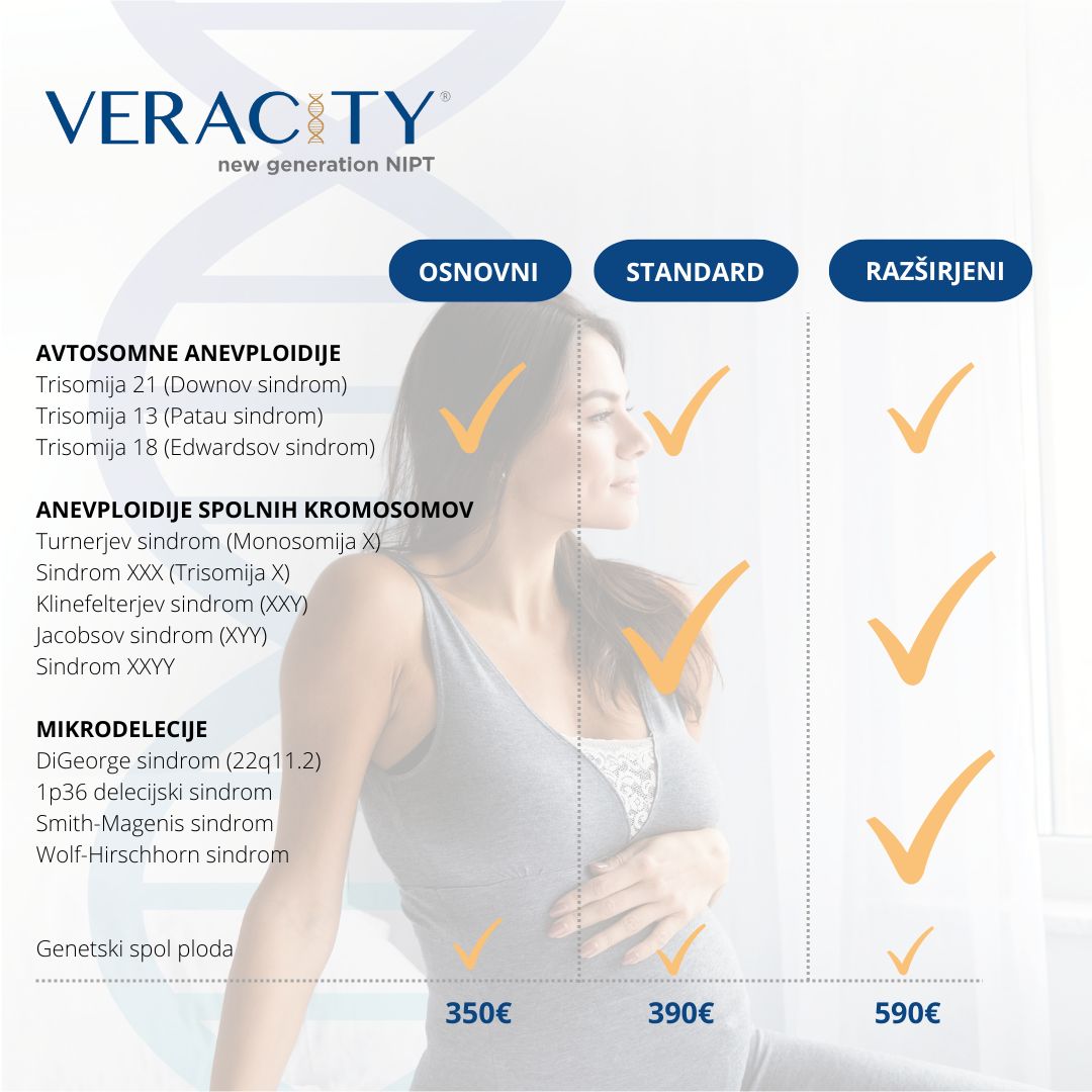 VERACITY je neinvazivni prenatalni test (NIPT), ki z visoko natančnostjo odkriva genetske nepravilnosti pri plodu iz vzorca krvi nosečnice že od 10. tedna nosečnosti dalje.