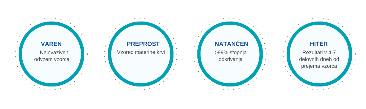 Med nosečnostjo plodova DNK potuje iz posteljice v materin krvni obtok in kroži skupaj z njeno lastno DNK. Napotni zdravnik bo odvzel vzorec krvi in ga poslal v naš laboratorij na analizo. Naša zaščitena tehnologija analizira DNK ploda in z visoko natančnostjo identificira genetske nepravilnosti. Rezultati so posredovani vašemu napotnemu zdravniku v nekaj delovnih dneh.