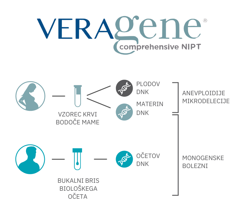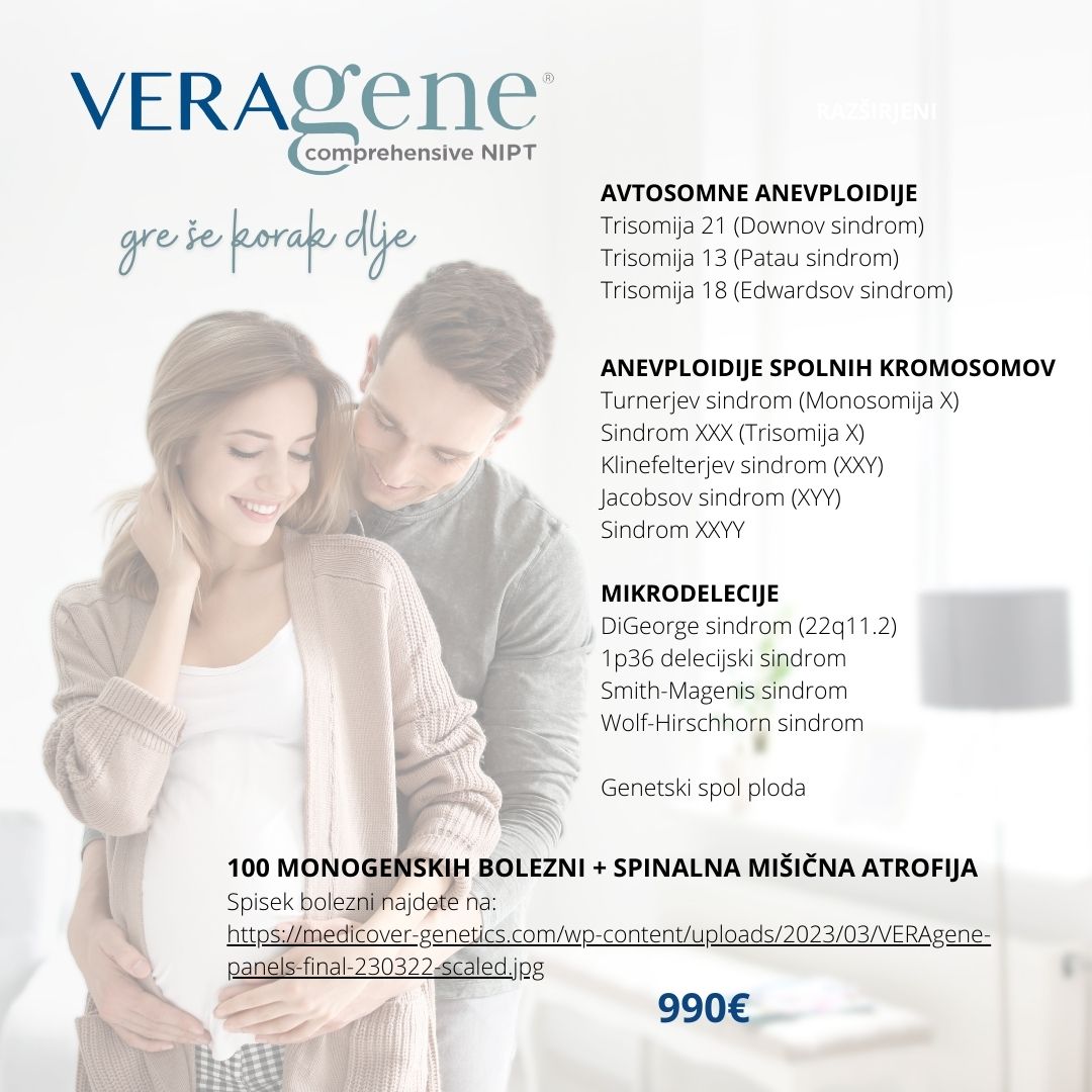 VERAgene je celovit neinvaziven prenatalni test (NIPT), ki z visoko zanesljivostjo prepozna nosečnosti z visokim tveganjem za določene genetske nepravilnosti ploda, kot so fetalne anevploidije, mikrodelecije in monogenske bolezni, že od 10. tedna nosečnosti dalje.