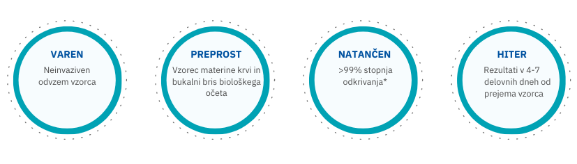 V nosečnosti DNK ploda potuje iz posteljice v vaš krvni obtok in kroži skupaj z vašo lastno DNK. Napotni zdravnik vam bo odvzel vzorec krvi in vzorec brisa ustne votline biološkega očeta ter ju poslal v naš laboratorij na analizo. Vzorec krvi, ki vsebuje vašo in plodovo DNK, bo analiziran za anevploidije in mikrodelecije. DNK biološkega očeta bomo skupaj z vašo DNK analizirali za odkrivanje morebitnih genskih različic. Naši zaščiteni tehnologija in bioinformatika bosta z visoko natančnostjo izračunali tveganje za prisotnost anevploidij, mikrodelecij ali monogenskih bolezni pri plodu.